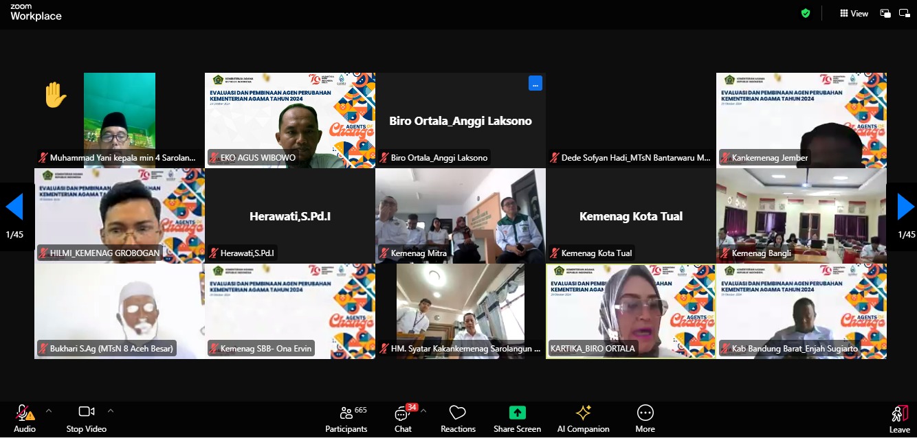 Agen Perubahan Kantor Kementerian Agama Kota Yogyakarta ikuti Evaluasi dan Pembinaan Agen perubahan Kementerian Agama melalui virtual Zoom bersama Sekjen Kemenag RI, Selasa, 29 Oktober 2024.