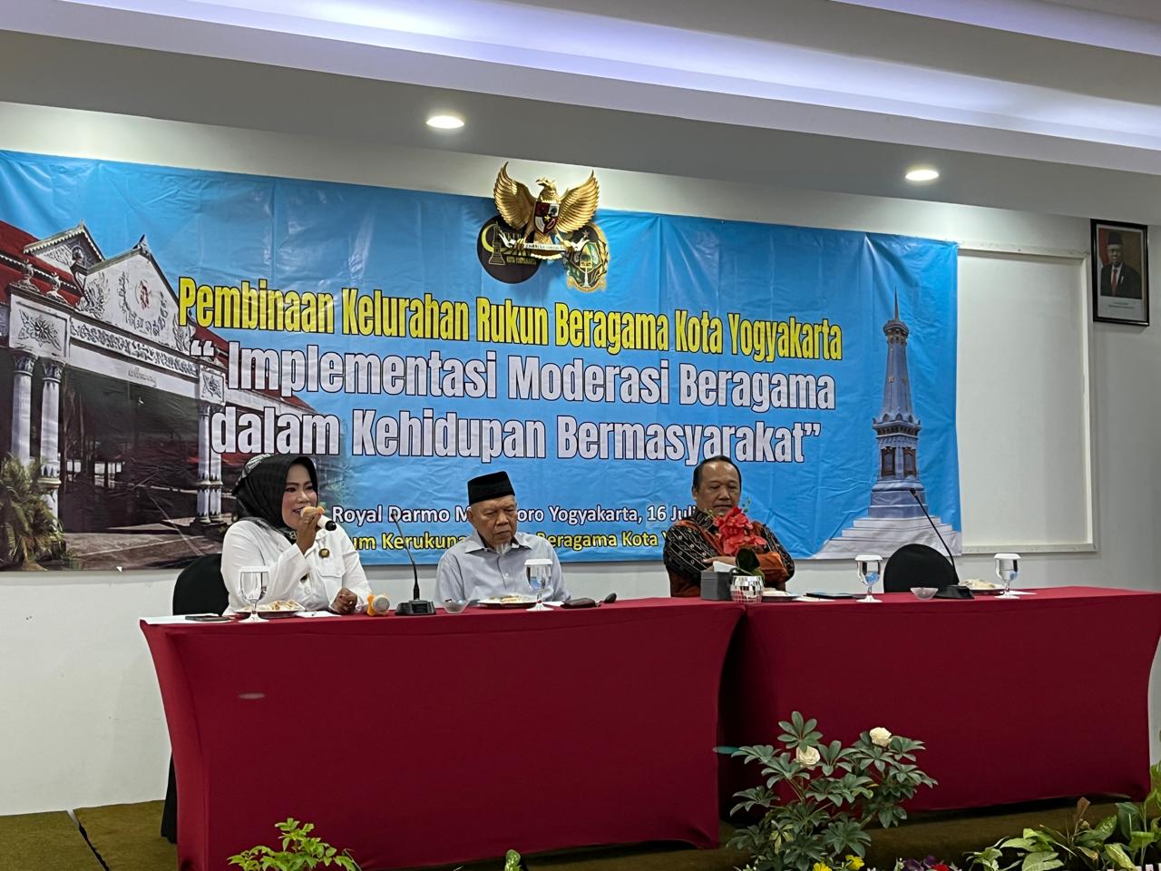 Yogyakarta (Humas) Pada hari Selasa 16/07/2024 dilaksanakan kegiatan “Pembinaan Kelurahan Rukun Beragama Kota Yogyakarta” dengan tema Implementasi Moderasi Beragama dalam Kehidupan Bermasyarakat. Bertempat di hotel Royal Darmo Malioboro Jl. Kemetiran Kidul No.54, Pringgokusuman, Gedong Tengen Kota Yogyakarta, diikuti 40 orang peserta terdiri dari perwakilan tokoh 6 agama Islam,Kristen,Katolik,Hindu,Budha,Konghucu , dan perwakilan anak muda dari 6 agama dari kelurahan Tegalpanggung Kemantren Danurejan Kota Yogyakarta. Kegiatan diselenggarakan oleh Forum Kerukunan Umat Beragama (FKUB) Kota Yogyakarta. Analis Kerukunan Umat’ Beragama Kankemang Kota Yogyakarta Zahara Emilya Girsang SAg., sekaligus sebagai anggota pengurus FKUB kota Yogyakarta turut hadir menjadi “Fasilitator” pada materi yang disampaikan oleh 3 narasumber Marwan DS wakil ketua FKUB Kota Yogyakarta, dengan materi Kriteria Kelurahan Rukun Beragama. Narasumber kedua Widiyastuti,SS.,M.Hum.,sekretaris Bakesbangpol kota Yogyakarta sampaikan materi ” Peran pemerintah dalam menjaga kerukunan umat beragama jelang pilkada 2024″. Dan sebagai narasumber ketiga Drs. YB. Jarot Budi Harjo dari Kevikepan Yogyakarta Timur dengan materi ” Peran keluarga dalam menanamkan nilai-nilai kerukunan umat beragama di masyarakat”.