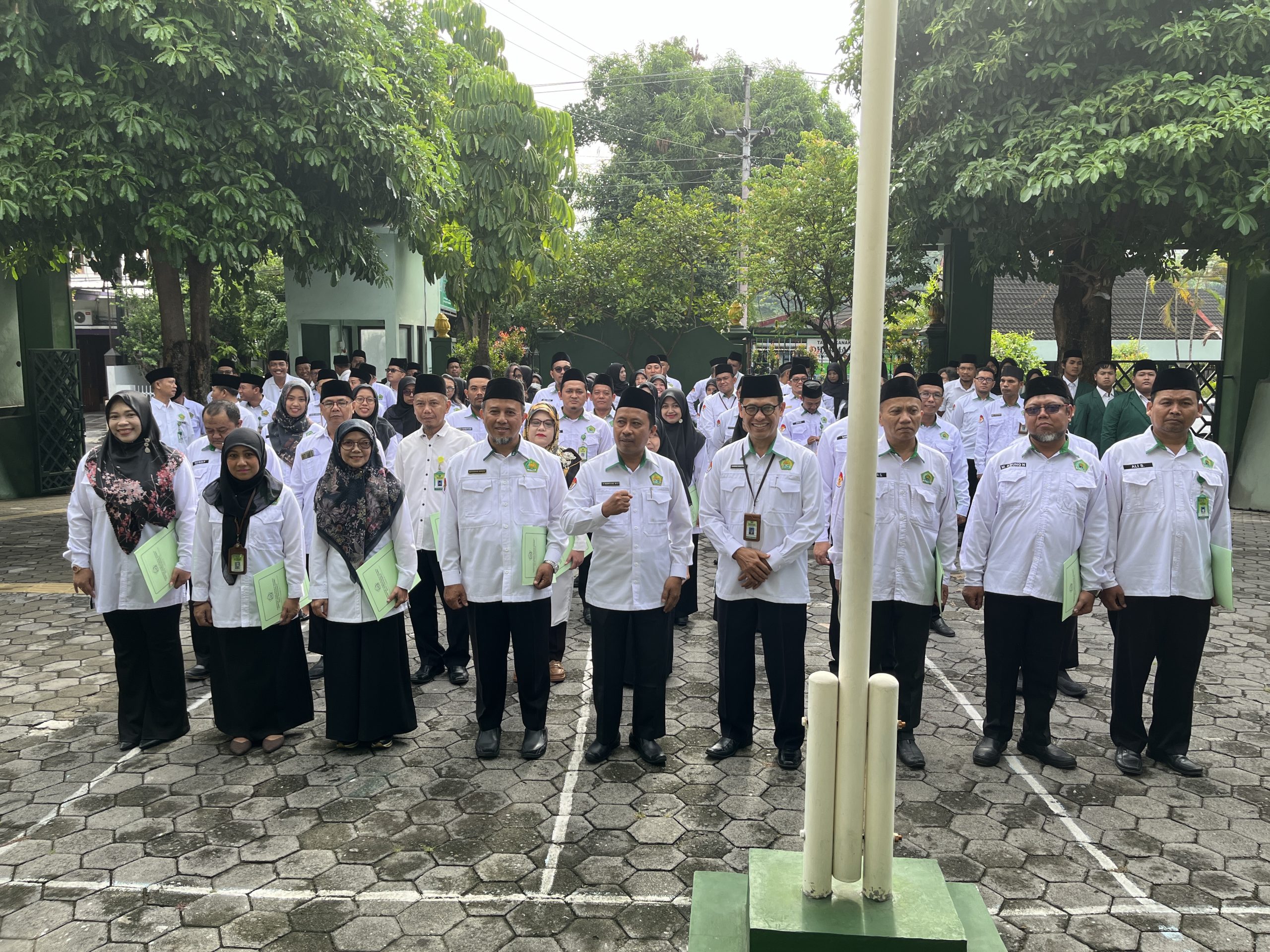 Apel pagi juga di serahkan SK mutasi pada 23 pegawai dilingkungan Kankemenag kota Yogyakarta. Komandan Prayitno, Mc Lisnawai,SPd, Dirijen Nuriyah Syafaatun, SSn, Doa Ismaryono, SPdI. [Ara]