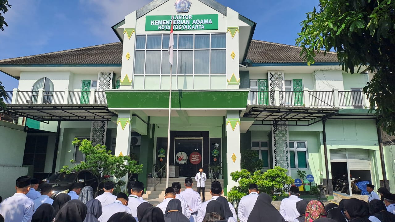 Apel pagi berlangsung di halaman Kantor Kementerian Agama Kota Yogyakarta, diikuti jajaran pimpinan, pegawai dan mahasiswa PKL. [eko]