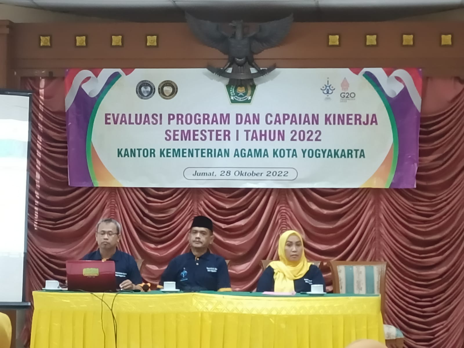 Kemenag Yogya (Humas) – Kantor Kementerian Agama Kota Yogyakarta menggelar Evaluasi Program dan Capaian Kinerja Semester 1 Tahun 2022. Kegiatan berlangsung di Bandungan, Salatiga Jawa Tengah. Diikuti kesempatan tersebut Kepala Seksi, Kepala KUA, Kepala Madrasah dan Kepala TU Madrasah.