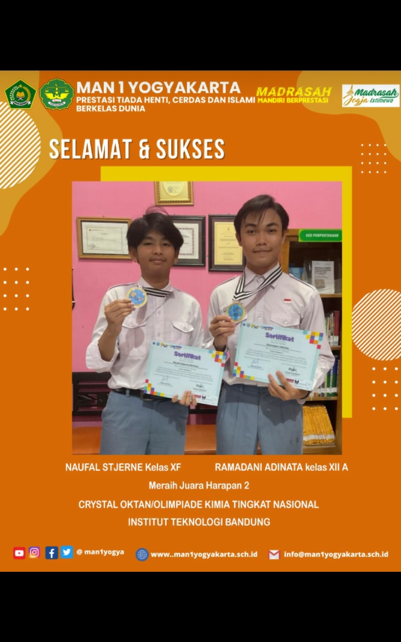 Yogyakarta (MAN 1 Yogya) – Dua Siswa MAN 1 Yogyakarta yaitu, Naufal Stjerne (10 F) dan Ramadani Adinata (12 A) meraih juara harapan 2 Crystal Oktan Olimpiade Kimia tingkat nasional tahun 2024 yang diselenggarakan oleh Institut Teknologi Bandung (ITB). Olimpiade ini diperuntukan kepada seluruh siswa SMA sederajat.