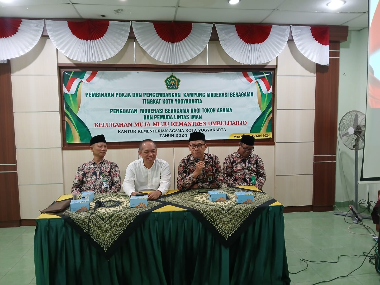 Yogyakarta (Humas)-Seksi Bimas Islam Kankemenag Kota Yogyakarta pada Rabu, 15/05/2024 menyelenggarakan kegiatan Pembinaan Pokja dan Pengembangan Kampung Moderasi Beragama di Kalurahan Muja Muju Umbulharjo. Kasi Bimas Islam Saeful Anwar, S.Ag.,MSI menyampaikan bahwa Kemenag menunjuk Kalurahan Muja Muju sebagai rintisan Kampung Moderasi karena di wilayah ini tinggal banyak etnis dan kelompok. Rumah Ibadah dari lintas agama juga banyak berdiri di wilayah ini. Disisi lain dengan banyaknya etnis ternyata kerukunan tetap terjaga.