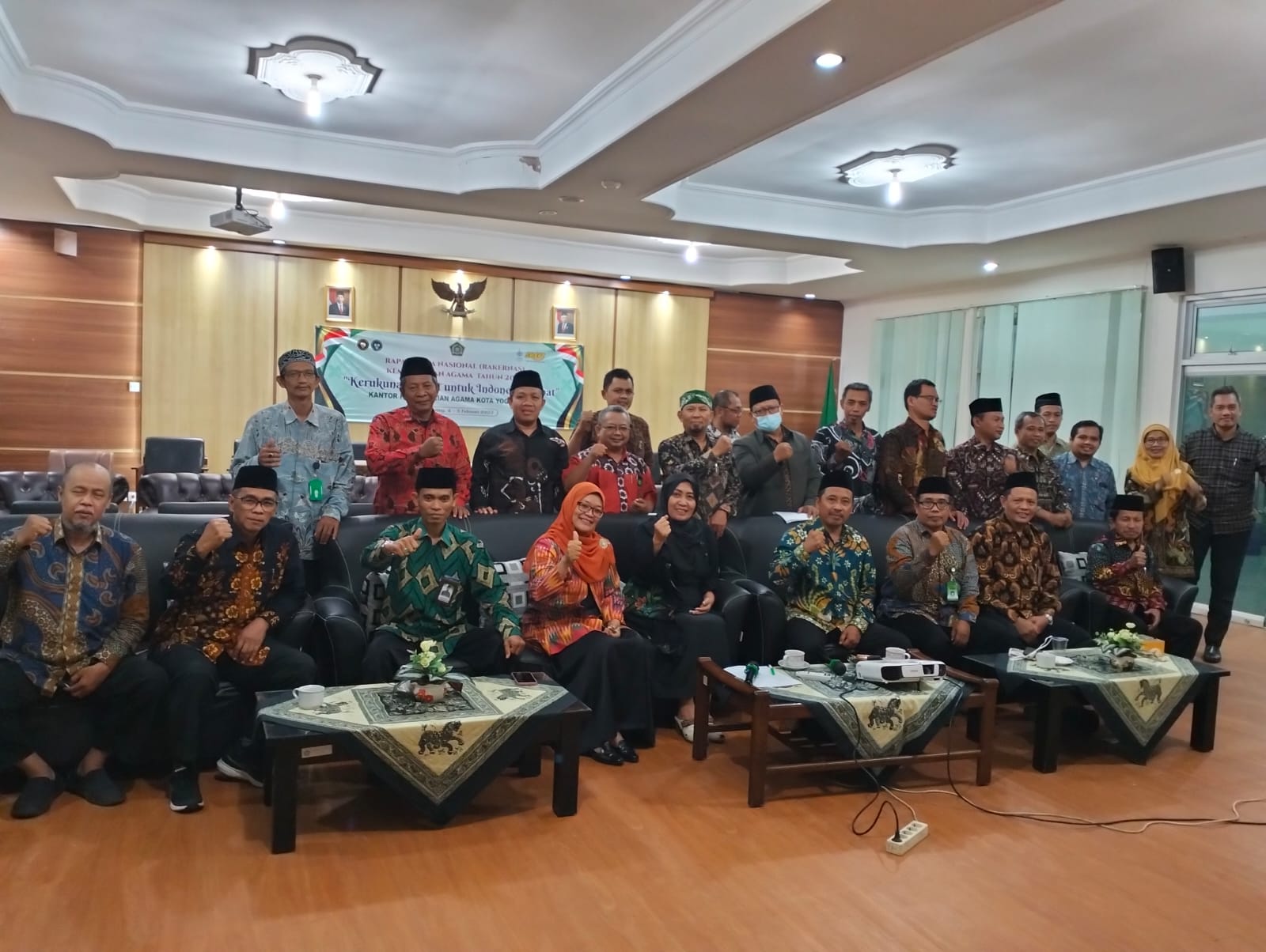 Yogyakarta (Humas) Penutupan Rapat Kerja Nasional Kementerian Agama RI tahun 2023 , Ahad 5/02/2023 secara daring diikuti oleh Kepala Kantor Kementerian Agama Kota Yogyakarta H. Nadhif, S.Ag., M.S.I., bersama Kasubag TU Dra. Hj. Noor Imanah,M.S.I, Kasi PD Pontren H. Arif Harjanto,SH., M.A.P., Kasi Bimas Islam Saeful Anwar,SAg,MSI., Kasi PHU Mohamad Tahrir,SE,M.M., Garazawa Suryana,S.Ag, Kepala MAN 2 Yogyakarta,Kepala MIN 1 Yogyakarta, Kepala KUA di 14 Kemantren. Rakernas yang telah dilaksanakan selama dua hari 4-5 Februari 2023, diakhiri dengan Penandatanganan berita acara ,Pembacaan dan penyerahan hasil rapat kerja nasional kemenag tahun 2023 dari DR.MH Thamrin, MM,MPd kepada Sekretaris Jendral Kemenag RI Prof.DR. H. Nizar Ali. Kesepakatan bersama pelaksanaan hasil Rapat Kerja Nasional sebagai berikut : Mengoordinasi dan menyusun rencana aksi pelaksanaan rekomendasi hasil rakernas Kemenag RI Tahun 2023 pada satuan organisasi/Kerja/Unit Pelaksana teknis, yang di prioritaskan 3 hal :