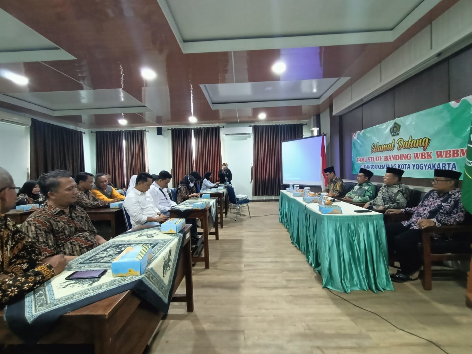 Yogyakarta (Humas) – Kantor Kementerian Agama (Kemenag) Kota Yogyakarta menjadi tuan rumah bagi kegiatan studi banding dari Kemenag Kabupaten Pangandaran terkait sertifikasi WBK WBBM, Jum’at (01/03/2024). Dalam acara yang berlangsung di Aula 2 Kantor Kemenag Kota Yogyakarta. Peserta yang hadir dari Kemenag Kabupaten Pangandaran berjumlah 10 orang,terdiri dari pimpinan kantor, perencana, bendahara, dan analis hukum.