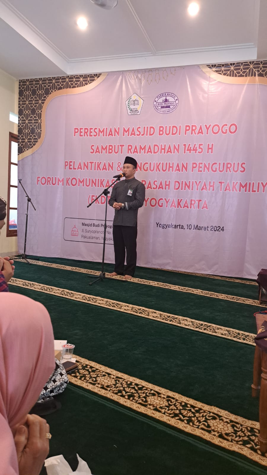 Yasin Musthofa, S.Ag. MA. kepala KUA Pakualaman memimpin doa dalam acara peresmian Masjid Budi Prayogo Jl. Purwanggan No.76, Gunungketur, Pakualaman, Kota Yogyakarta, Daerah Istimewa Yogyakarta 55166, pada hari Ahad, 10 Maret 2024.