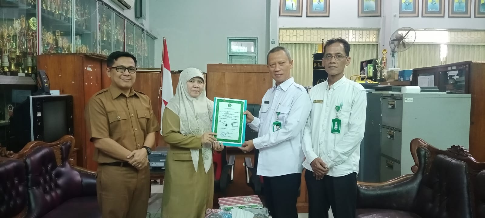 Yogyakarta (KUA Umbulharjo)-Kepala KUA Umbulharjo Sehona,S.Ag didampingi Penyuluh Agama Islam Saebani S.Ag menyerahkan Sertifikat Arah Kiblat Masjid Baitul Ilmi pada Senin, 26/08/2024 bertempat di Komplek SMA 8 Yogyakarta,