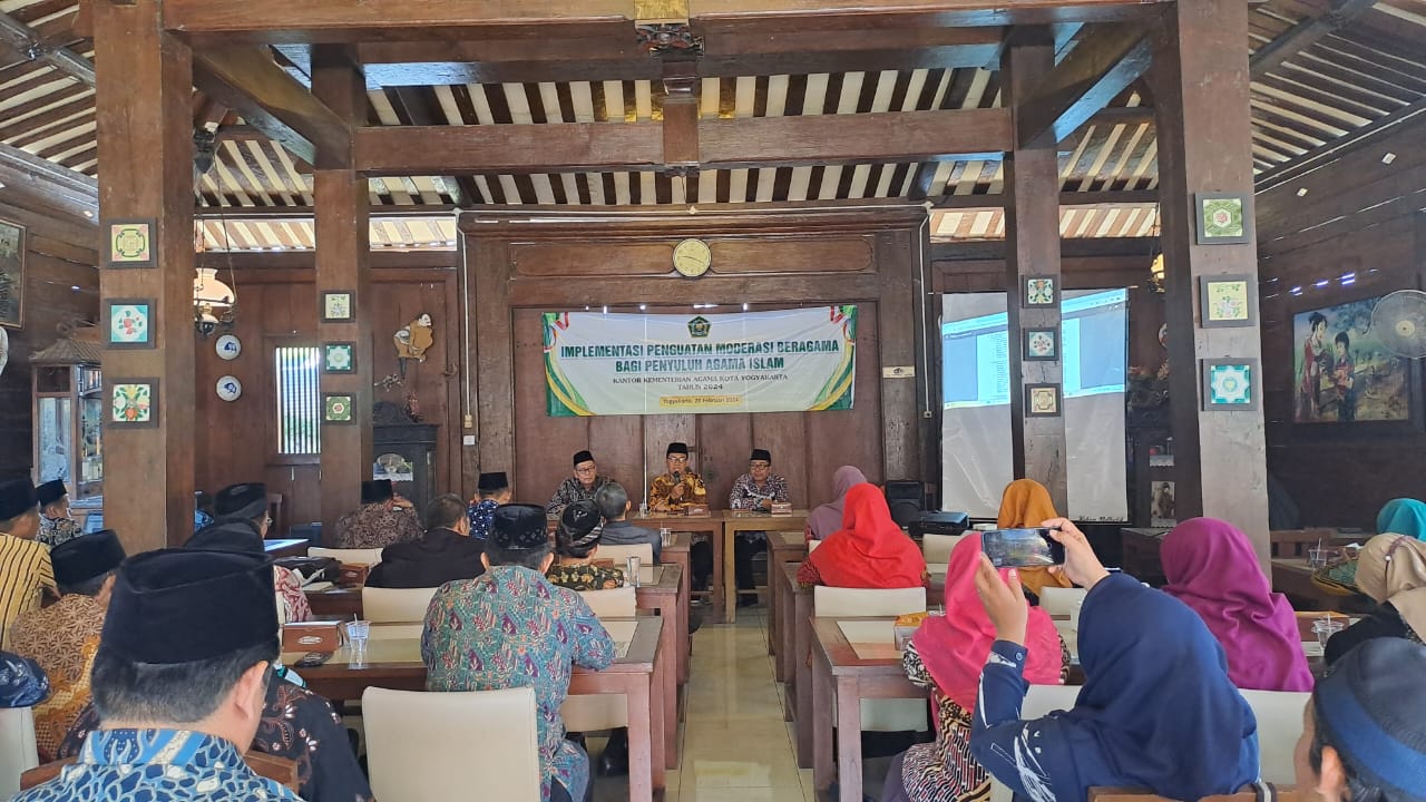 Yogyakarta (Humas) – Bimas Islam menggelar kegiatan Implementasi Penguatan Moderasi Beragama bagi Penyuluh Agama Islam bertempat di Kebon Ndelik. Acara ini dihadiri oleh para Penyuluh Agama Islam Fungsional dan P3K. Kegiatan diawali dengan penyampaian sambutan dari Kasi Bimas Islam, Saeful Anwar, S. Ag., M. S. I. Saeful mengungkapkan bahwa kegiatan ini merupakan amanah dari Kementerian Agama RI dalam Rapat Kerja (Raker) serta sebagai upaya konsolidasi dan koordinasi. “Moderasi beragama tidak hanya berlaku secara internal, tapi juga harus diimplementasikan ke dalam masyarakat umum,” tambah Saeful.