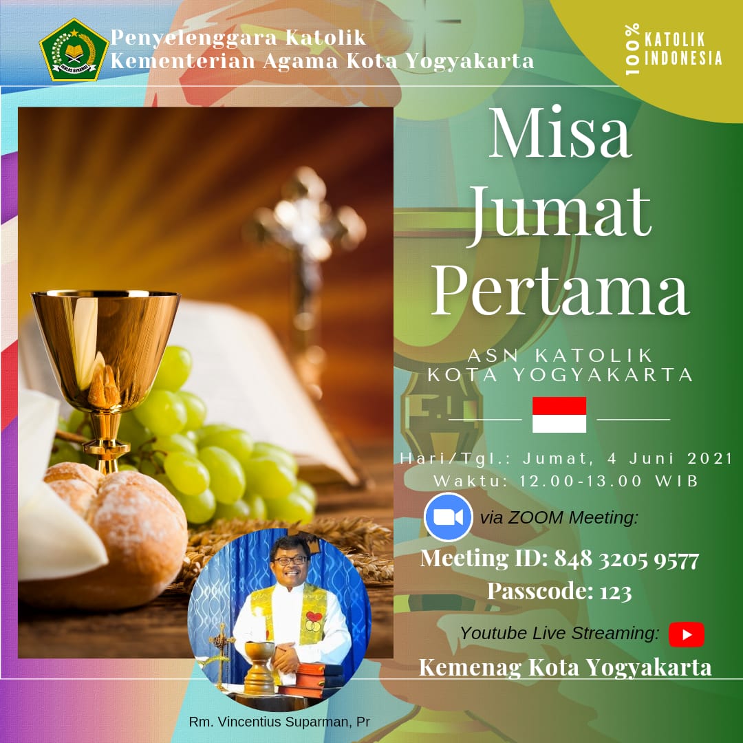 Penyelenggara Katolik Kantor Kementerian Agama Kota Yogyakarta menyelenggarakan Misa Jumat Pertama bagi para ASN Katolik se-kota Yogyakarta. Misa yang berlangsung di aula I Kenkemenag Kota Yogyakarta itu dipimpin oleh Rm. Vincentius Suparman, Pr, pastor Paroki St. Albertus Agung Jetis.
