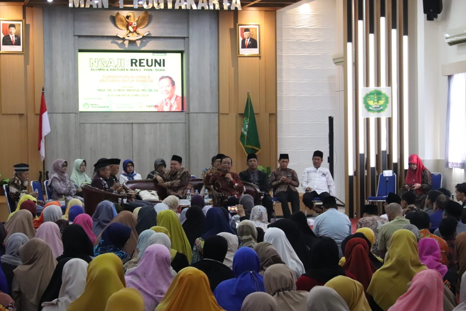 Yogyakarta (MAN 1 Yogya) — Kebesaran dan keharuman nama madrasah antara lain ditentukan kiprah alumninya. Kebanggaan alumni MAN 1 Yogyakarta terhadap almamater antara lain diwujudkan dengan kegiatan Ngaji dan Reuni yang digelar setiap tiga bulan. Ada yang spesial dari Ngaji dan Reuni yang diselenggarakan di bulan Mei ini, yakni hadirnya alumni yang sangat inspiratif, Prof. Dr. H. Moh Mahfud MD, SH, SU, MIP (19/05/2024).