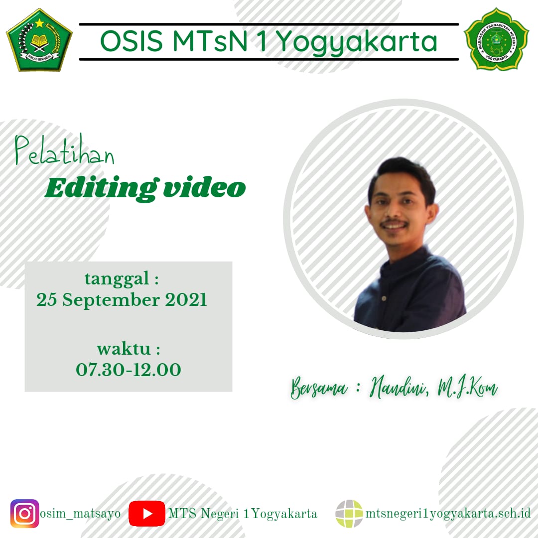 Yogyakarta (MTsN 1 Yogyakarta) – OSIS MTs Negeri 1 Yogyakarta menggelar kegiatan Pelatihan Editing Video pada Sabtu (25/09/2021) menggunakan Smartphone bagi siswa-siswi MTs Negeri 1 Yogyakarta kelas VII dan VIII Kegiatan ini dilaksanakan secara tatap muka (luring) dengan menerapkan protokol Kesehatan. yang ketat, yaitu memakai masker, mencuci tangan dan menjaga jarak serta membatasi peserta yang hadir ke madrasah agar tidak berkerumun.