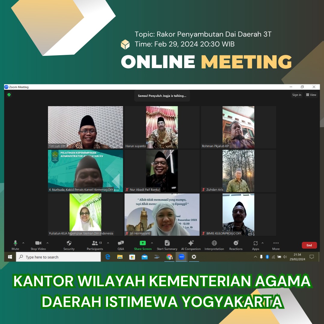 Dalam rangka sosialisasi program Dai 3T di Kementerian Agama RI, melalui media Zoom meeting, kamis 29/2 diadakan koordinasi terkait dengan penempatan Dai sejumlah 6 orang pada daerah rawan yang ada di Daerah Tertinggal Daerah Istimewa Yogyakarta.