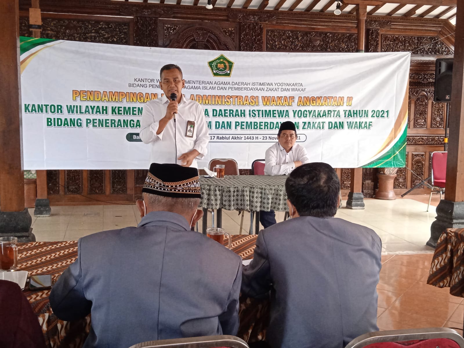 Kegiatan Pendampingan Administrasi Data Wakaf tersebut dibuka Kepala Bidang PENAIS ZAWA Kanwil Kemenag Provinsi DIY di Bale Timoho (23/11). Sigit Warsita mengatakan, pendampingan ini bertujuan untuk melakukan pendataan Tanah Wakaf yang ada dimasing-masing Kantor Urusan Agama.