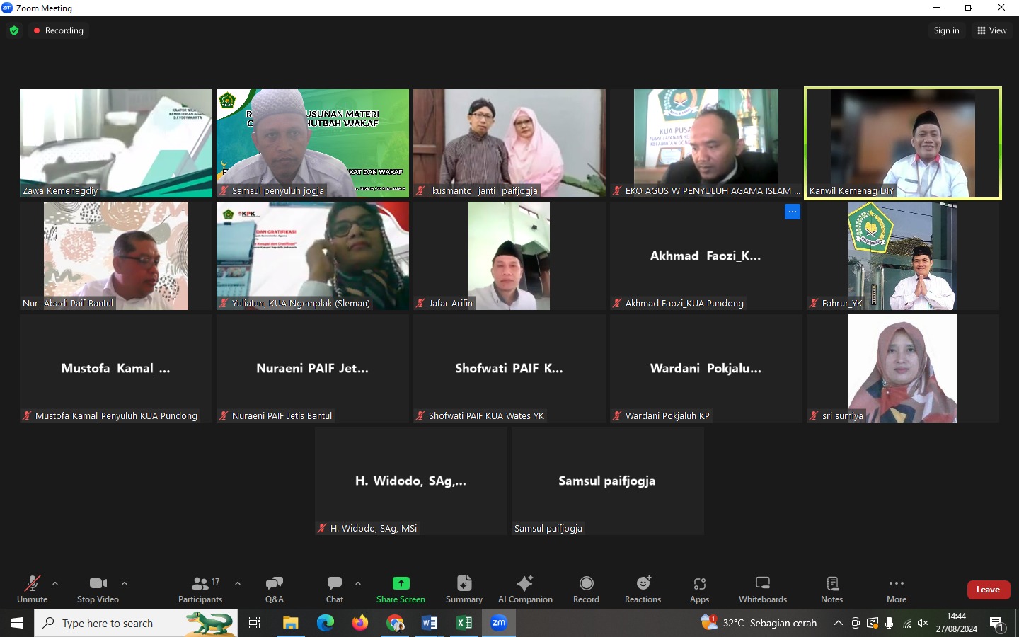 Kelompok Kerja Penyuluh Agama (Pokjaluh)Kantor Kementerian Agama Kota Yogyakarta Eko Agus Wibowo, S. Sos. I, Syamsul Maarif, S. Th. I. MSI, Fahrurrozi, S. Th. I dan Kusmanto, S. Ag mengikuti Rapat Koordinasi (Rakordasi) penyusunan materi ceramah dan kutbah wakaf yang diadakan Bidang Penerangan Agama Islam dan Pemberdayaan Zakat dan Wakaf Kanwil Kemenag DI. Yogyakarta, Selasa, 27 Agustus 2024 melalui Zoom.