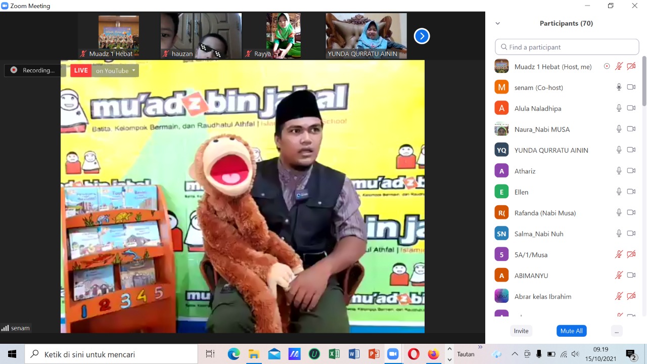 Yogyakarta (RA Mu’adz Bin Jabal) – Jumat (15/10) dalam rangka memperingati GPP nabi Muhammad SAW, RA Mu’adz Bin Jabal Yogyakarta mengadakan kegiatan special mengundang pendongeng Kak Dani untuk bercerita tentang Nabi Muhammad di forum Zoom Meeting dan live streaming youtube Muadz bin jabal..