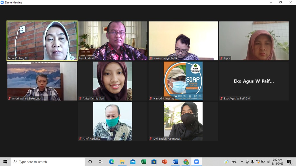 Yogyakarta (Kemenag Kota) – Dalam rangka mempertahankan predikat Wilayah Birokrasi Bersih Melayani (WBBM), Sabtu (12/03/2022) Kantor Kementerian Agama Kota Yogyakarta menyelenggarakan rapat koordinasi penyusunan rencana kerja pembangunan Zona Integritas (ZI) Kantor Kemenag Kota Yogyakarta tahun 2022. Rakor dipimpin Kasub. Bagian TU Dra. Hj. Noor Imanah, MSI diikuti tim ZI melalui zoom meeting.