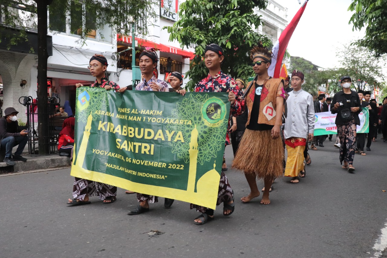 Yogyakarta(MAN 1 YK)—Santri Pondok Pesantren Al-Hakim MANPK MAN 1 Yogyakarta turut memeriahkan Kirab Budaya Santri, yang diikuti oleh para santri se-Kota Yogyakarta, Ahad(06/11/2022) sore, dengan rute mulai Jalan Malioboro hingga monumen Serangan Umum 1 Maret. Kegiatan ini merupakan bagian Kegiatan peringatan Hari Santri Nasional. Para santri menggunakan kostum adat nuansa nusantara.