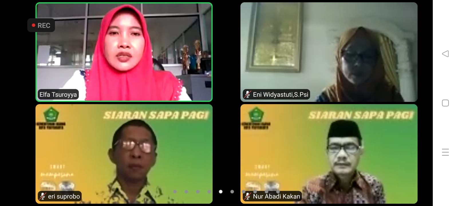 Yogyakarta (Kankemenag) – Siaran Sapa Pagi (SISAPA) Kantor Kementerian Agama Kota Yogyakarta, Kamis (26/) yang diikuti seluruh ASN melalui zoom meeting, menghadirkan Kasi Pendidikan Madrasah Elfa Tsuroyya, S.Ag., M.Pd.I., M.Pd selaku narasumber.