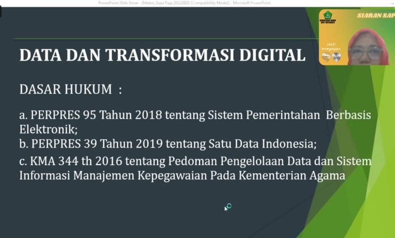 Yogyakarta (Humas) – Pemerintah terus mendorong penyempurnaan data dan transformasi digital khususnya dalam bidang kepegawaian. Implementasi data di Simpeg akan menggunakan nomor induk kepegawaian (NIP) sebagai basis pengelolaan data kepegawaian. Hal tersebut diungkapkan Analis Kepegawaian Kantor Kementerian Agama Kota Yogyakarta, Halimah Trisayuni, S.Ag. saat menjadi narasumber Siaran Sapa Pagi (Sisapa) Kamis (1/12/2022).