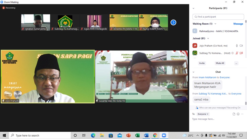 Yogyakarta (Kankemenag) – Siaran Sapa Pagi (SISAPA) Kantor Kementerian Agama Kota Yogyakarta, Senin (22/11/2021) Ketua Kelompok Kerja Pengawas (Kapokjawas) Pendidikan Agama Islam Drs. H. Susanto, M.Pd mengajak pada jajaran ASN Kantor Kemenag Kota Yogyakarta untuk senantiasa meningkatkan iman dan kinerja. Meningkatkan iman bisa dilakukan dengan; membaca dan memahami kitab sucinya masing-masing, mentadabburi dan mengimbaskan pada orang lain, meningkatkan ilmu pengetahuan sesuai bidang dan tupoksinya masing-masing, serta meningkatkan profesionalitas dalam bekerja.