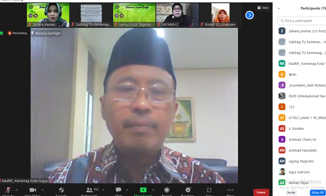 Yogyakarta (Humas) Siaran Sapa Pagi (SiSaPa) Kantor Kementerian Agama Kota Yogyakarta, edisi Kamis 3 November 2022 merupakan agenda rutin setiap Kamis Pagi pukul 07.30., diikuti oleh seluruh ASN Kantor Kementerian Agama Kota Yogyakarta secara virtual zoom terpantau 181 partisipan yang bergabung.