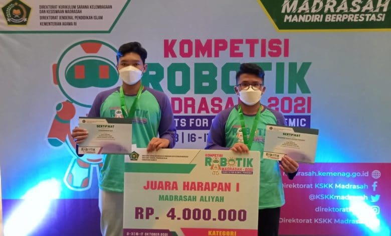 Yogyakarta (MAN 1 YK)— Muhammad Dhesta Zhafran Purnawan dan Fathurrahman Kafi, dua siswa MAN 1 Yogyakarta berhasil raih juara harapan 1 dalam Kompetisi Robotik Madrasah ke-7 Tahun 2021, yang diselenggarakan Direktorat Jenderal Pendidikan Islam Kementerian Agama RI, Sabtu-Ahad (16-17/10/2021), di Mall Alam Sutera Tangerang Selatan Banten.