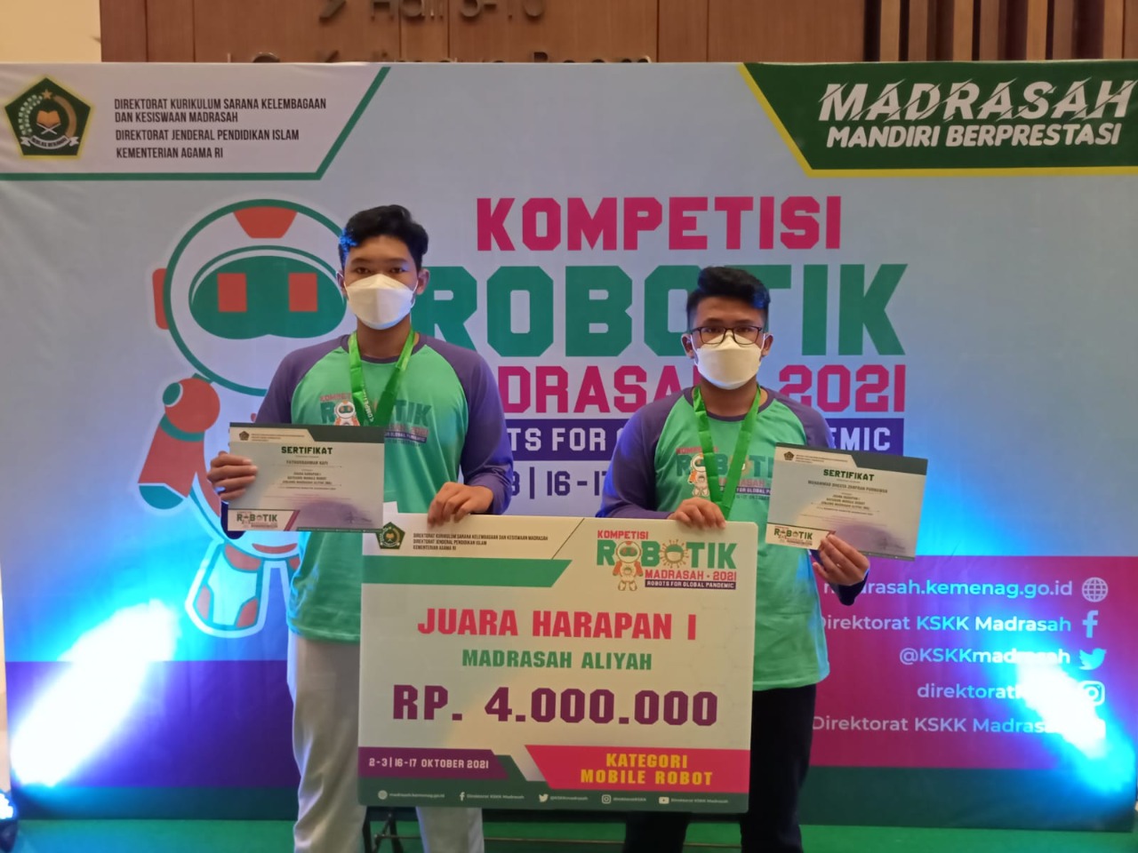 Dua siswa tersebut mampu bersaing dengan peserta madrasah lainnya, dalam kompetisi robot, kategori ‘Mobile Robot’ jenjang Madrasah Aliyah se-Indonesia. Atas prestasi tersebut, keduanya mendapat sertifikat penghargaan dan uang pembinaan, sebesar empat juta rupiah, yang diberikan oleh Prof. Dr. H. Nizar Ali, M. Ag Sekretaris Jenderal Kementerian Agama Republik Indonesia, Ahad (17/10/2021), dalam acara pengumuman pemenang kompetisi, yang disiarkan secara langsung melalui youtube: https://youtu.be/JKObQt61PQ0