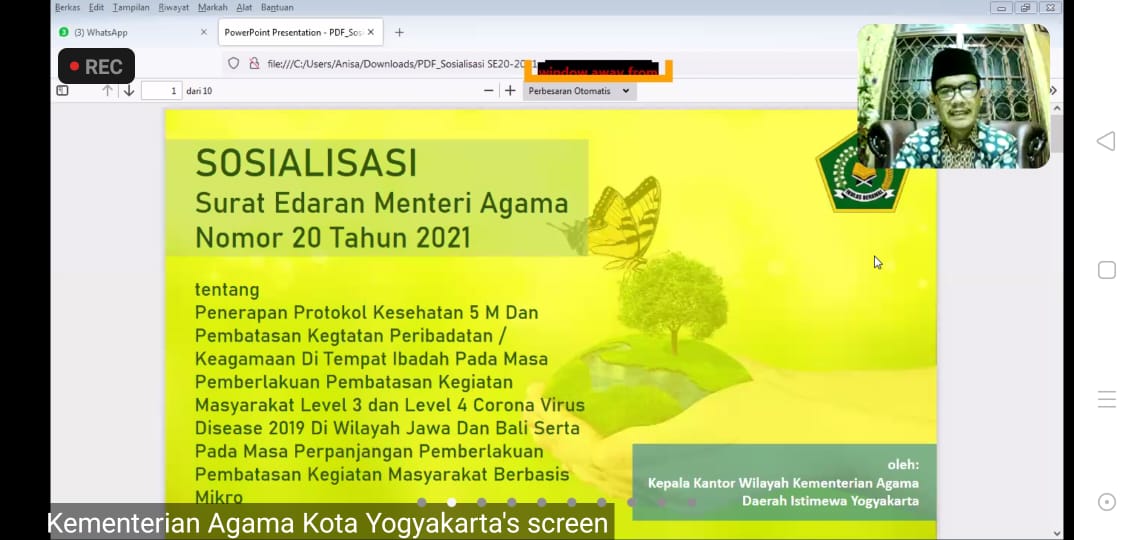 Kepala Kantor Kementerian Agama Kota Yogyakarta Drs.H. Nur Abadi, MA dan Ketua Satgas Covid 19 Ka Subbag Tata Usaha Dra. Hj. Noor Imanah, M.S.I menyelenggarakan sosialisasi SE Menag no 20 tahun 2021 kepada segenap ASN dilingkungan Kemenag Kota Yogyakarta secara virtual melalui Zoom Meeting hari Sabtu, 24 Juli 2021, pukul. 19.30 – 21.30 WIB.