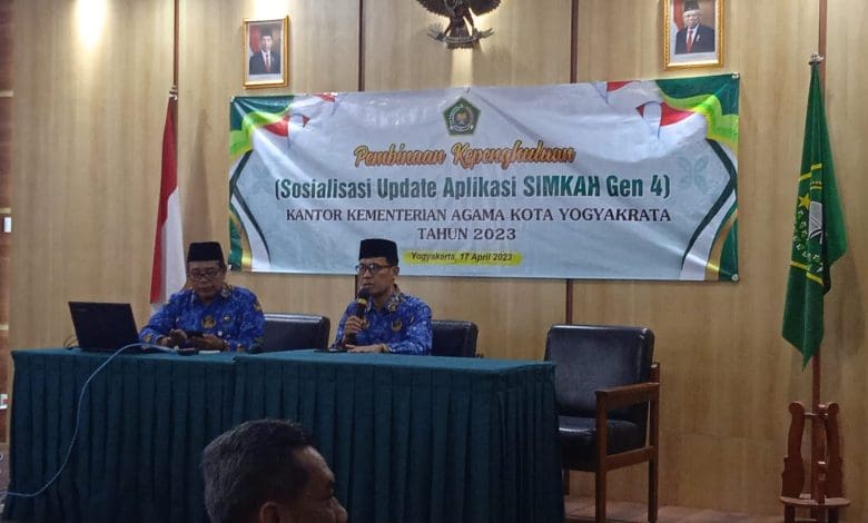 Yogyakarta ( Bimas Islam) : Telah dilaksanakan Kegiatan Pembinaan Kepenghuluan Sosialisasi Update Aplikasi SIMKAH Generasi 4 di Kankemenag kota Yogyakarta pada hari senin, 17/04/2023 bertempat di Aula l lantai ll Kemenag Kota Yogyakarta. Peserta pada kegiatan tersebut Kepala KUA dan Penghulu Se- Kota Yogyakarta berjumlah 24 orang. Narasumber Samanto, SAg, MH., Penghulu sekaligus ahli IT di Kementrian Agama. Kegiatan diselenggarakan seksi Bimas Islam Kankemenag Kota Yogyakarta.