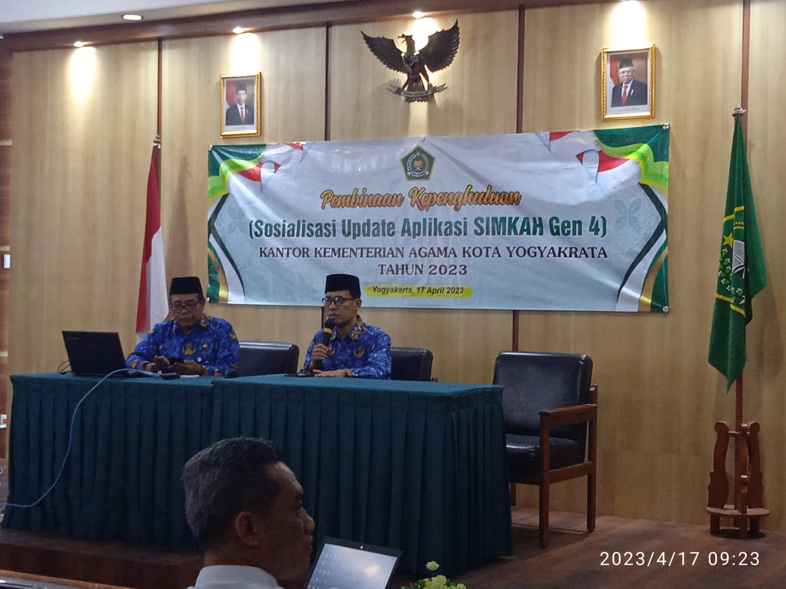 Yogyakarta ( Bimas Islam) : Telah dilaksanakan Kegiatan Pembinaan Kepenghuluan Sosialisasi Update Aplikasi SIMKAH Generasi 4 di Kankemenag kota Yogyakarta pada hari senin, 17/04/2023 bertempat di Aula l lantai ll Kemenag Kota Yogyakarta. Peserta pada kegiatan tersebut Kepala KUA dan Penghulu Se- Kota Yogyakarta berjumlah 24 orang. Narasumber Samanto, SAg, MH., Penghulu sekaligus ahli IT di Kementrian Agama. Kegiatan diselenggarakan seksi Bimas Islam Kankemenag Kota Yogyakarta.