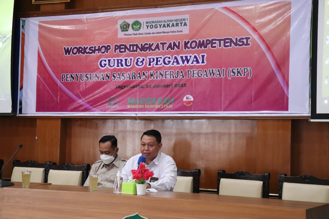 Yogyakarta (MAN 1 Yogya) — Sasaran Kinerja Pegawai (SKP) adalah sarana untuk penilaian kinerja Aparatur Sipil Negara (ASN), isinya berupa rencana kerja dan target pegawai. Mulai Juli 2021 terdapat perubahan penyusunan SKP. Untuk memberikan pemahaman mengenai teknis penyusunan SKP berdasarkan peraturan terbaru, MAN 1 Yogyakarta selenggarakan workshop penyusunan SKP, Senin (24/1/2022), di Aula lantai 2 MAN 1 Yogyakarta.