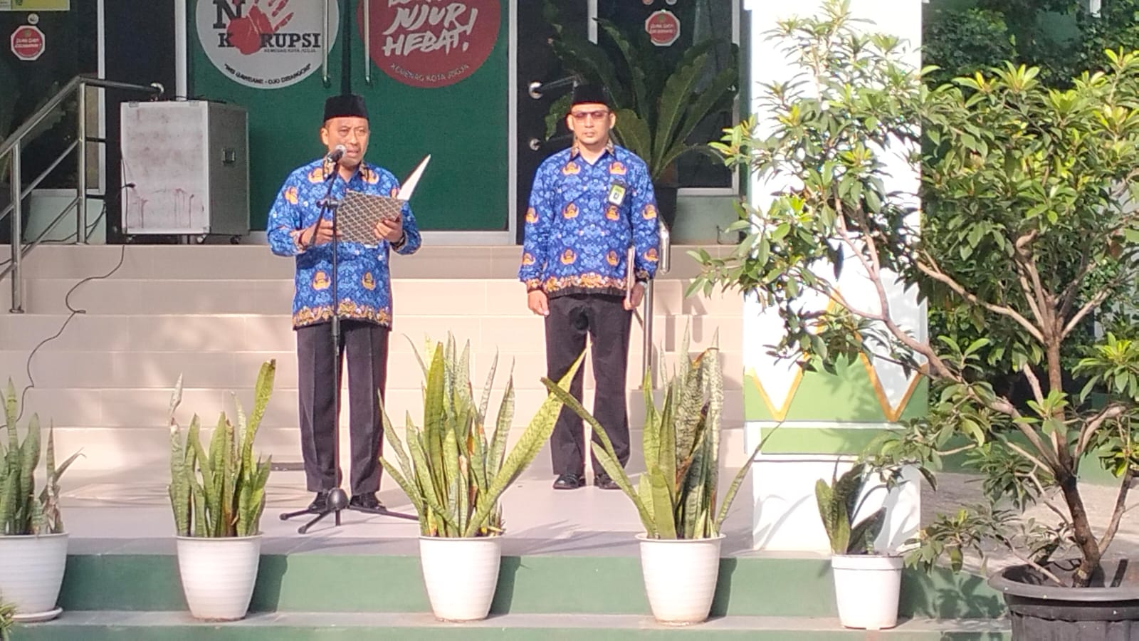 Upacara penghormatan bendera digelar di halaman kantor dengan peserta Kasubbag TU, Kasi, Penyelenggara, Kepala KUA serta para ASN Kantor Kementerian Agama Kota Yogyakarta. [eko]